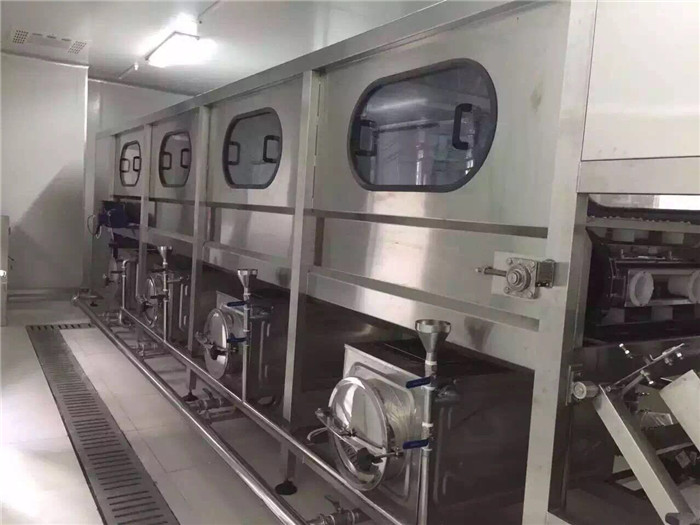 2、該設備適用5加侖瓶使用(也可適用3加侖瓶,但需提供樣瓶),該設備集洗瓶、灌裝、套蓋、壓蓋和成品送出為一體。洗瓶機采用多道洗滌液噴射和消毒液噴射,達到洗滌、消毒的目的,消毒液可以循環使用。封口機可以自動封口,輸送瓶蓋過程口配有衛淋裝置,以確保瓶蓋無菌清潔。
