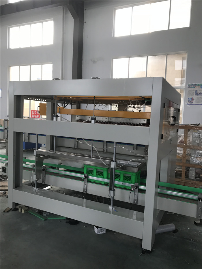 本機(jī)是一種智能性全自動裝箱機(jī),采用高速分配裝置包裝各種容器,包裝塑料扁瓶、圓瓶、不規(guī)則形瓶,各種大小玻璃瓶,圓瓶、橢圓形瓶、方形罐及紙罐等,另外也適用于帶隔板的包裝箱。由瓶夾(內(nèi)置橡膠,以防損傷瓶體)夾住瓶體,放入打開的紙箱當(dāng)中,當(dāng)抓頭抬起時(shí),將紙箱排出,送至封箱機(jī),本機(jī)采用P.L.C +觸摸顯示屏控制。設(shè)有缺瓶報(bào)警停機(jī),無瓶不裝箱安全裝置。大大減少生產(chǎn)人員和勞動強(qiáng)度,是自動化規(guī)模生產(chǎn)必不可缺少的設(shè)備。