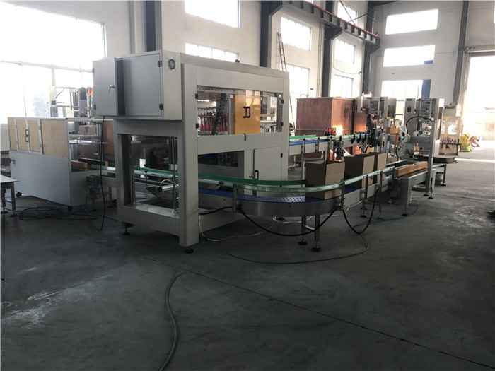 本機是一種智能性全自動裝箱機,采用高速分配裝置包裝各種容器,包裝塑料扁瓶、圓瓶、不規則形瓶,各種大小玻璃瓶,圓瓶、橢圓形瓶、方形罐及紙罐等,另外也適用于帶隔板的包裝箱。由瓶夾(內置橡膠,以防損傷瓶體)夾住瓶體,放入打開的紙箱當中,當抓頭抬起時,將紙箱排出,送至封箱機,本機采用P.L.C +觸摸顯示屏控制。設有缺瓶報警停機,無瓶不裝箱安全裝置。大大減少生產人員和勞動強度,是自動化規模生產必不可缺少的設備。